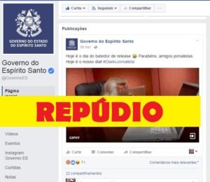 O Sindicato dos Jornalistas Profissionais no Estado do Espírito Santo e a Fenaj lamentam e repudiam a atitude do governo estadual em postar nas suas redes sociais uma imagem de um macaco ‘batendo no teclado’ com os dizeres “hoje é o dia do batedor de release. Parabéns, amigos jornalistas.” ignorando assim toda a formação ética e social dos profissionais responsáveis por levar informação de qualidade à sociedade.