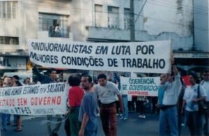 serviços públicos. Na mesma década, diz Suzana, o Sindijornalistas/ES participou do movimento regional “Renúncia Já,” junto com diversas entidades sindicais, denunciando o então governador Albuíno Azeredo que “não conseguia gerenciar o governo do Espírito Santo”. O Sindijornalistas/ES teve participação decisiva na criação da Central Única dos Trabalhadores (CUT) e, ainda em termos regionais, atuou em ações contra a privatização da Vale, então Companhia Vale do Rio Doce (CVRD), e da siderúrgica de Tubarão (CST).