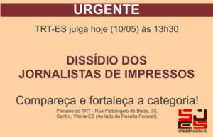 O Tribunal Regional do Trabalho julgará hoje, 10 de maio, às 13h30 o Dissídio dos Jornalistas de Impressos referente à data base de 01 de maio de 2016.